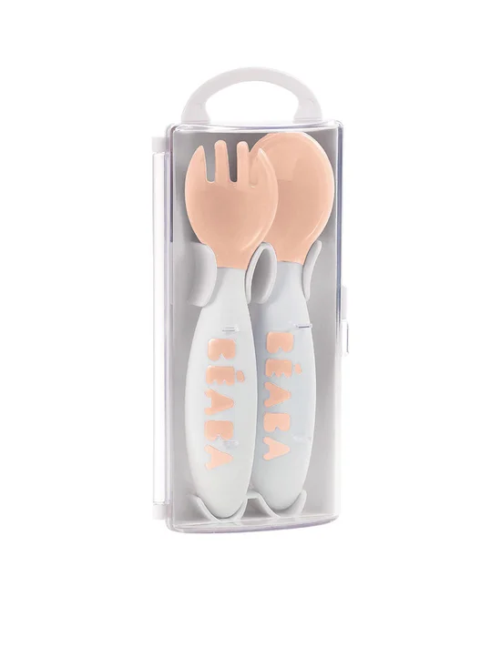 BEABA 2nd age training fork and spoon is a fork and spoon set. Perfectly adapted to baby’s grasp, the set comes with a protective storage case for meals on the go