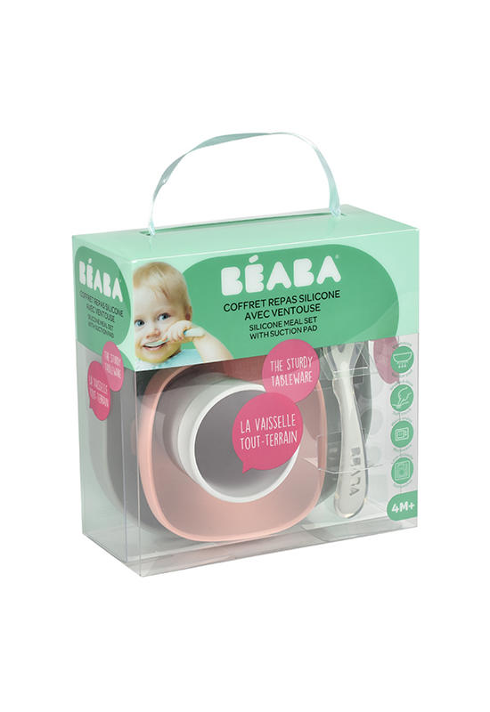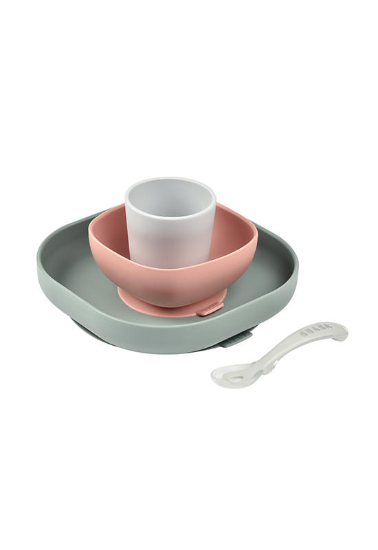 Beaba Silicone Meal Set is a set of plate and bowl that feature suction bottoms to fit any surface, cup and silicone spoon that are ergonomically designed to fit perfectly in little hands.