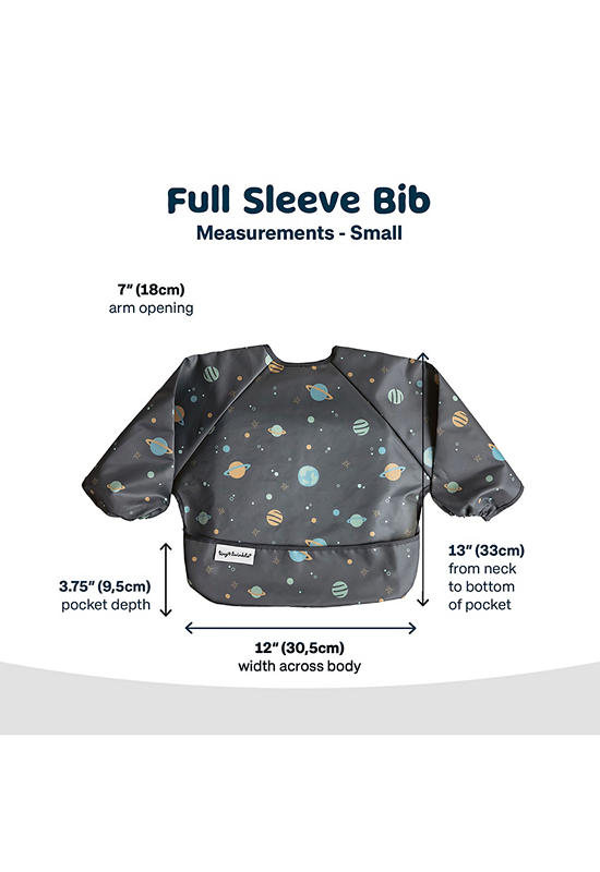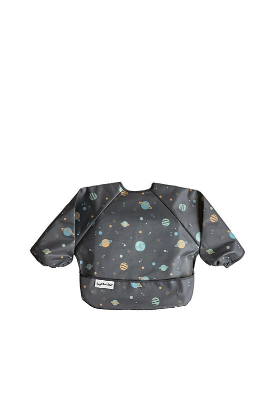 Boy Toddler Bibs Mess-proof Full Sleeve Space from TINY TWINGLE Constructed with a lightweight, waterproof polyester made from recycled plastic, these full sleeve bibs feature long sleeves for ultimate clothing protection. Elasticized cuffs prevent messes from sneaking in, while a large flip pocket remains open to catch spills and food. The tug-proof, soft closure is gentle on little ones, and the fabric is certified OEKO-TEX Standard 100.
