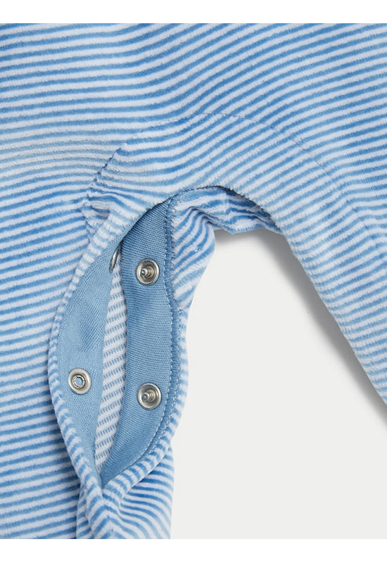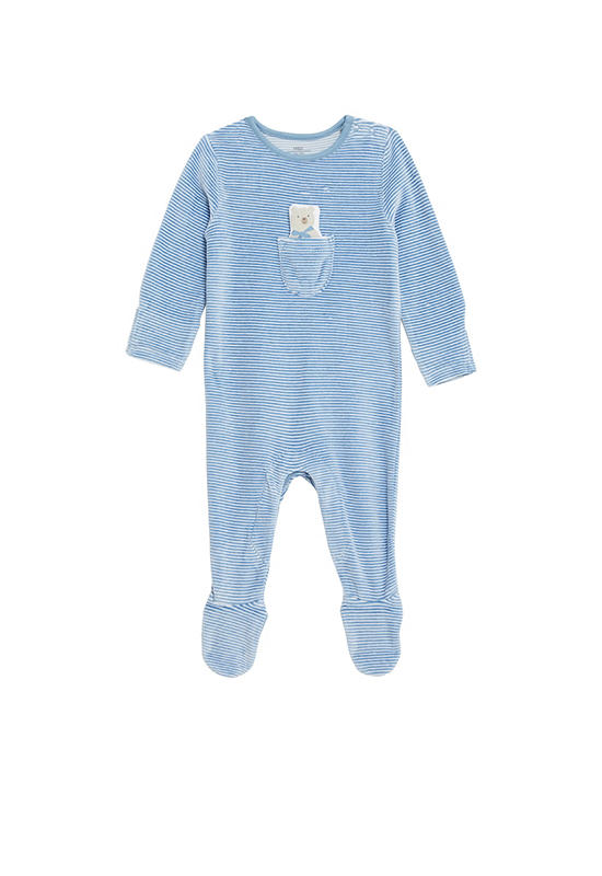 MARKS & SPENCER KIDS This striped, cotton-rich velour sleepsuit features a cute bear inside the chest pocket. The cosy long-sleeved design has poppers at the shoulder and gusset for easy changing. Babysafe toes provide comfort and safety, with anti-slip technology from 9 Months. Integral anti-scratch mitts on ages up to 6 Months.