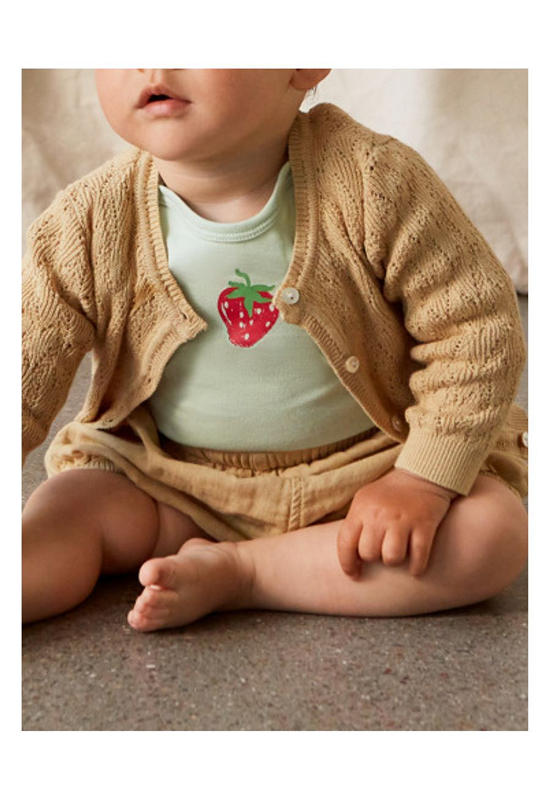 Foss comes in a 2-pack of baby bodysuits. One is in pink with a strawberry print, while the other is mint green with a print of a single strawberry on the front. Foss has an easy snap closure at the neck and between the legs.