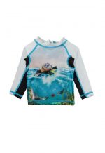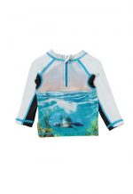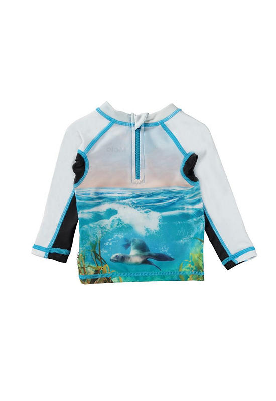 Long sleeve rash guard for small children with a placement print on the front and back. The print is of a surfing sea lion and its friends under the surface of the ocean. The rash guard has a practical zip closure on the back to make it easy to slip on and off. It is constructed in recycled, stretchy polyester and offers a high level of 50+ UV protection from the sun. The product is CE-marked and tested according to standard EN-13758-1.