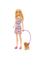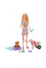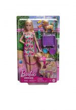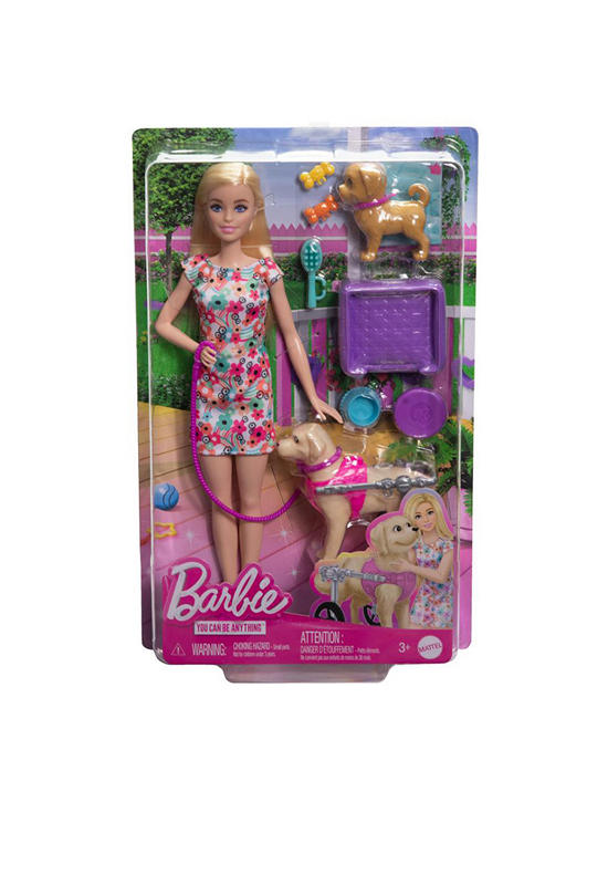 Fall in puppy love with Barbie and this doggy duo This pet set comes with a puppy and a big dog that has a wheelchair with working wheels. These best buds love taking walks with Barbie! Kids can remove and reattach the wheelchair to the doggy who needs a little extra love and care! Pet accessories include a leash that fits in doll hands, food bowl, pet bed, and yummy bone treats. Kids ages 3 years old and up.
