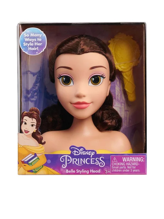 The Disney Princess Belle Styling Head from DISNEY KIDDO holds endless hair play possibilities! Belle features beautiful, shiny brown hair that is perfect for brushing and styling. This brave Princess comes with nine fun, wear and share accessories: one hairbrush, one Mrs. Potts hair barrette, one Chip hair barrette, three hair spirals, two elastic bands, and one tiara.