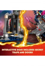The 2-tiered dojo building kit includes a courtyard where characters can engage in aerial combat on the end of movable transparent sticks, a trap activated by a tree branch, a secret door concealing a sword accessory, a treewith a chain for detaining prisoners, a weapons rack with 4 weapon accessories, wires for the ninja to zip around on using their hooks, a wolf’s head that drops a large stone, the blood moon and the gong of shattering.
