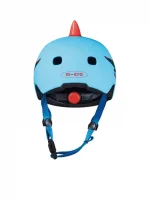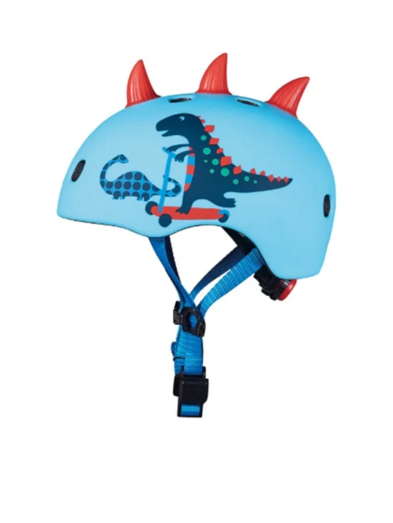 Helmet 3D scootersaurus from Micro brand name. The outside uses 100% PC Shell material. The inside uses a special PE foam lined with polyester fabric. There is a vent for ventilation. Helps to dissipate heat well safety strap and magnetic lock give confidence to protect baby’s head.