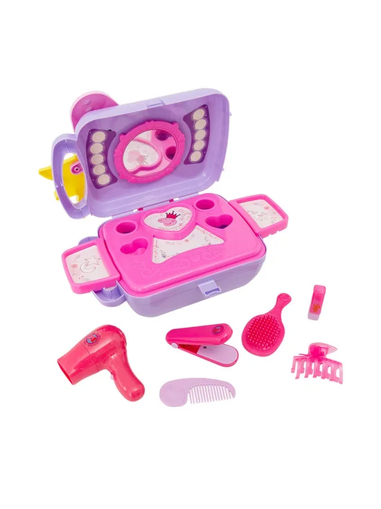 Fun PEPPA PIG shaped playset case with all the hair accessories you need for your Peppa Beauty Parlour. Open the case, apply the stickers, attach the mirror, place the counter into the base of the case with the side panels attached and you’re ready to start styling. Features battery operated hair dryer, play straighteners, comb, lipstick, hair clip and brush. All accessories pack neatly away in the case, perfect for on the go play.