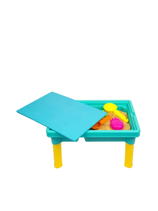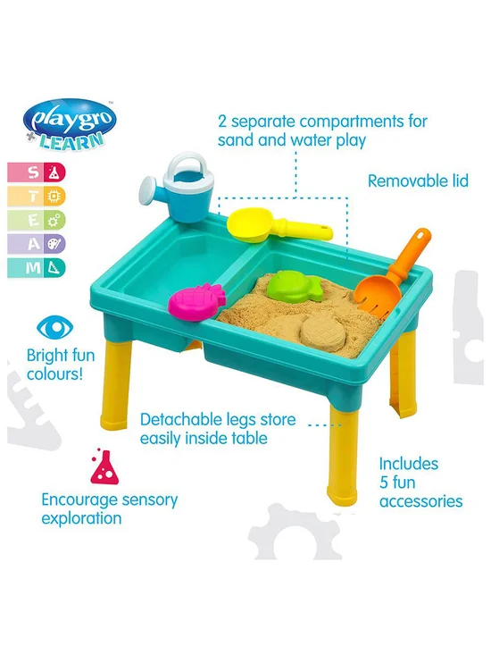 PLAYGRO Explorer Water & Sand Table, Digging ahead!! Nothing is more fun for toddlers than sandy hands and water play and this Sensory Explorer Sand and Water Play Table makes it all possible! Featuring two basins to separate elements and 5 accessories for digging, raking, pouring and creating sand shapes. Fantastic for creating pretend play landscapes, toddlers will enjoy touching, feeling and exploring the new textures, sensations and characteristics of objects from nature such as water, sand, leaves, bark, flowers and pebbles or our fantastic fully sealed water play toys.Includes a handy lid to keep the weather out, this table is equally functional for indoor play. Great for storage of smaller items, with the lid on it also doubles as a flat surface for extended play. Legs are removable for easy storage.