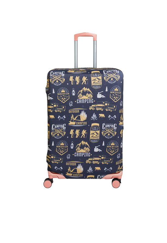 Luggage cover from ELEMENTS Made by polyester fabric mixed with spandex. The fabric can be stretched like a swimsuit. Use it to cover your travel bag. To prevent wrinkles or various impurities at the bottom is a Velcro zipper. Easy to take off and wear tighten the bag’s surface. Makes the bag stand out and be easily remembered.